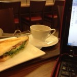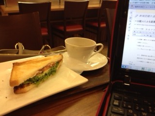 一人でカフェに立ち寄り、サンドイッチ齧りながら、ブログ書いてます。