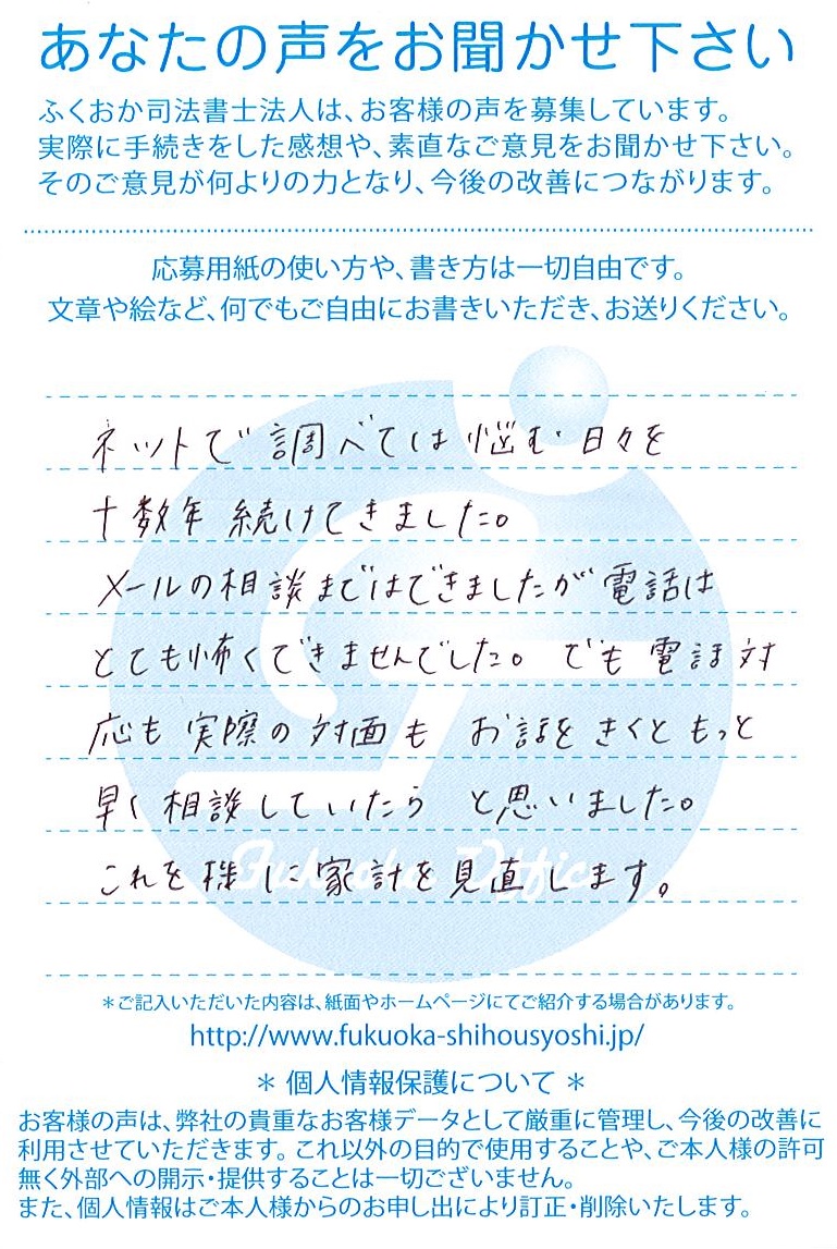 ご相談頂いた方からよく伺うのが「もっと早く相談すればよかった」というお言葉です。
