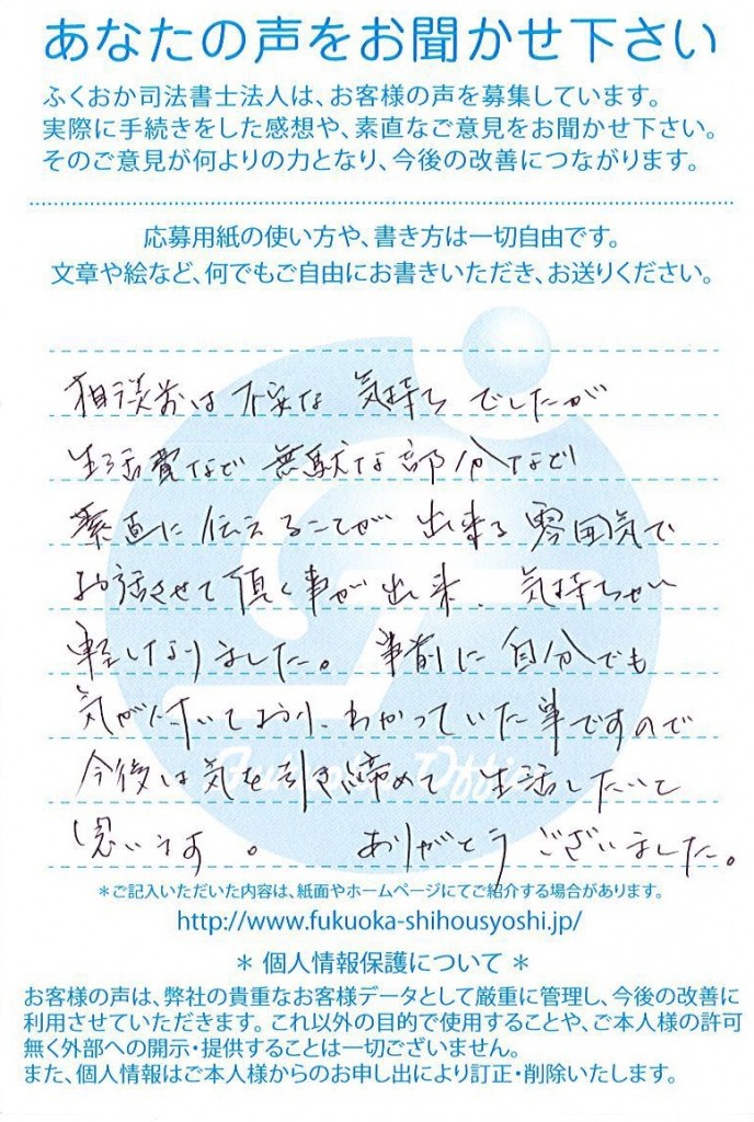 ふくおか司法書士法人では、不動産登記、商業登記、過払い請求・個人再生・自己破産・任意整理・時効援用などの債務整理、相続・遺言、成年後見、債権回収 交通事故などについての手続き全般を行っております。それぞれの業務に専門スタッフを配置し、依頼者のためにふくおか司法書士法人で対応しうる限りの支えになることを心がけております。また、より高い専門性を生み出すために弁護士、税理士、社会保険労務士等の他士業の先生方とのネットワークを駆使し、ワンストップで対応。ふくおか司法書士法人を選んでご来所いただいたお客様に、満足して、笑顔で帰っていただくために、私たちはどんな苦労も惜しみません。