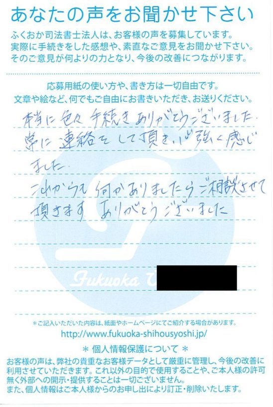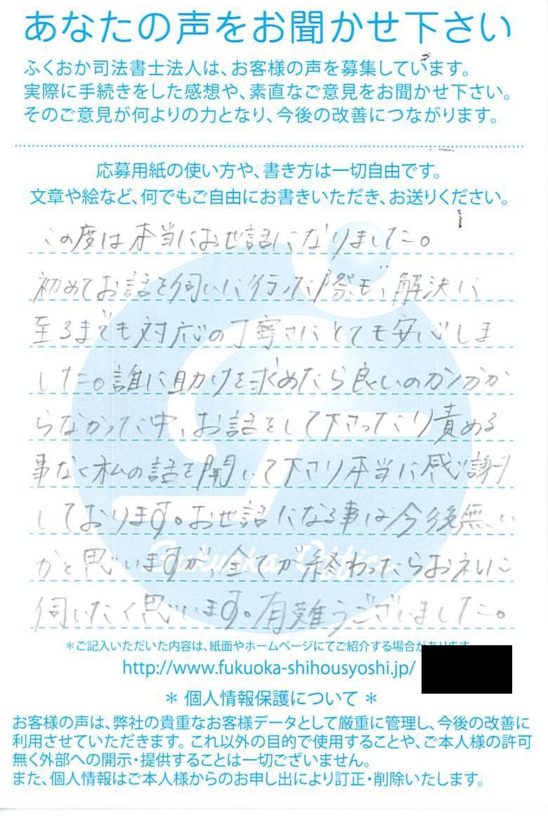ふくおか司法書士法人では、不動産登記、商業登記、過払い請求・個人再生・自己破産・任意整理・時効援用などの債務整理、相続・遺言、成年後見、債権回収 交通事故などについての手続き全般を行っております。それぞれの業務に専門スタッフを配置し、依頼者のためにふくおか司法書士法人で対応しうる限りの支えになることを心がけております。また、より高い専門性を生み出すために弁護士、税理士、社会保険労務士等の他士業の先生方とのネットワークを駆使し、ワンストップで対応。ふくおか司法書士法人を選んでご来所いただいたお客様に、満足して、笑顔で帰っていただくために、私たちはどんな苦労も惜しみません。